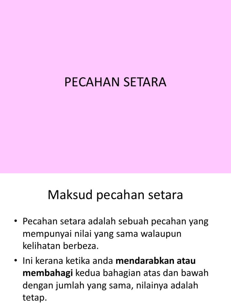 Untuk mengonversi pecahan itu tidak dalam istilah yang paling sederhana ke bentuk yang setara itu adalah kita membagi pembilang dan penyebutnya faktor umum terbesar. Similarly How do I. Adik-adik hari ini cikgu akan menerangkan apa itu pecahan dengan menggunakan slide.